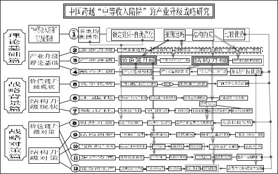 第一至四章为理论基础篇,明确“中等收入陷阱”与产业升级的基本理论。第五至七章是战略背景篇,考察中等收入阶段中国产业升级的优势条件以及工业化和城市化的现实背景。具体而言,在价值链升级方面考察“中国制造”在全球价值链中的地位和优势,在结构升级方面考察产业结构视角下中国的工业化现状以及城乡结构视角下中国的城市化现状。工业化和城市化是经济发展的根本动力,关于两者的考察也是关于价值链升级动力的具体考察。第八章到第十二章是战略对策篇,从对外开放、结构调整、结构—速度关系、优势条件变迁和生产方式变革的角度探讨跨越“中等收入陷阱”的产业升级对策。